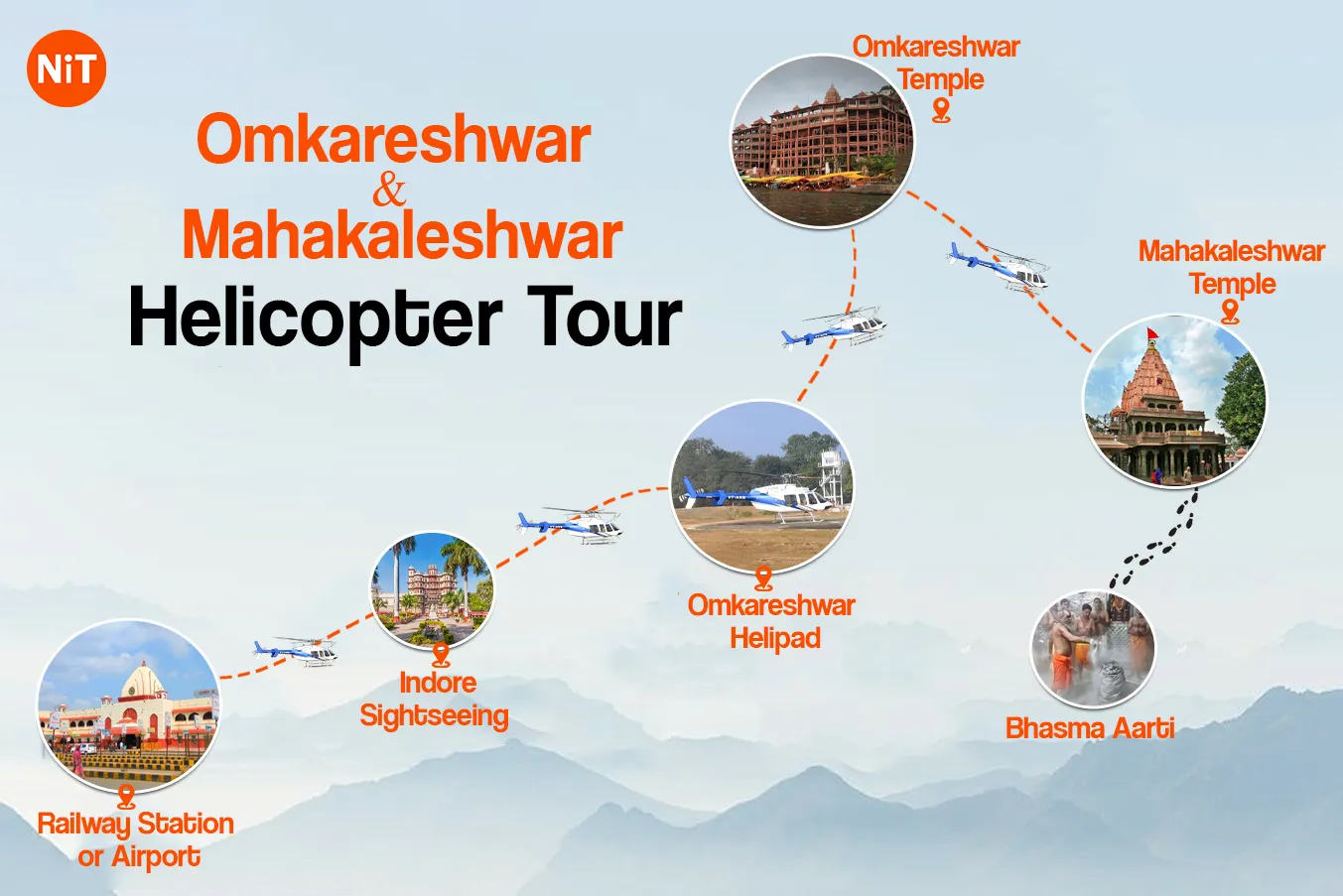- Helicopter transfers between Indore, Omkareshwar and Ujjain
